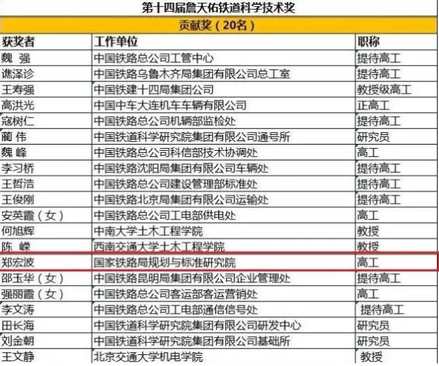 2019年获第十四届詹天佑铁道科学技术奖