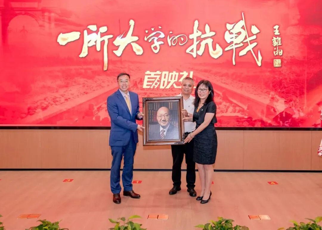 ▲交通大学北加州校友会会长聂社春校友、西南交大苏州校友会会长吕雪男校友专程赶来参加首映礼,并代表林同炎学长的爱女林伯那女士向母校捐赠林同炎学长画像,学校党委常委、宣传部部长代表学校接受捐赠