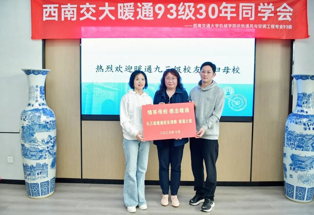座谈会上,93级暖通校友集体捐赠建环系校友活动室“暖通之家”,建环系副主任孙亮亮代表学校接受捐赠,并与93级校友代表合影留念。