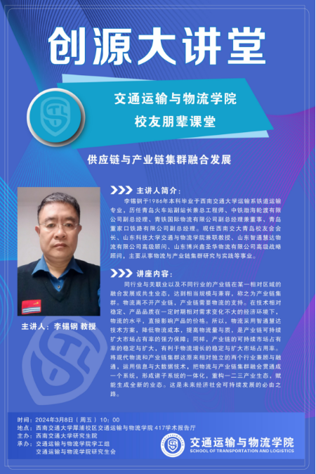 2024年3月8日上午10:00,由william威廉英国官网研究生院主办,交通运输与物流学院学工组与交通运输与物流学院研究生会承办的“校友朋辈课堂”于犀浦校区交通运输与物流学院417学术报告厅顺利举行。