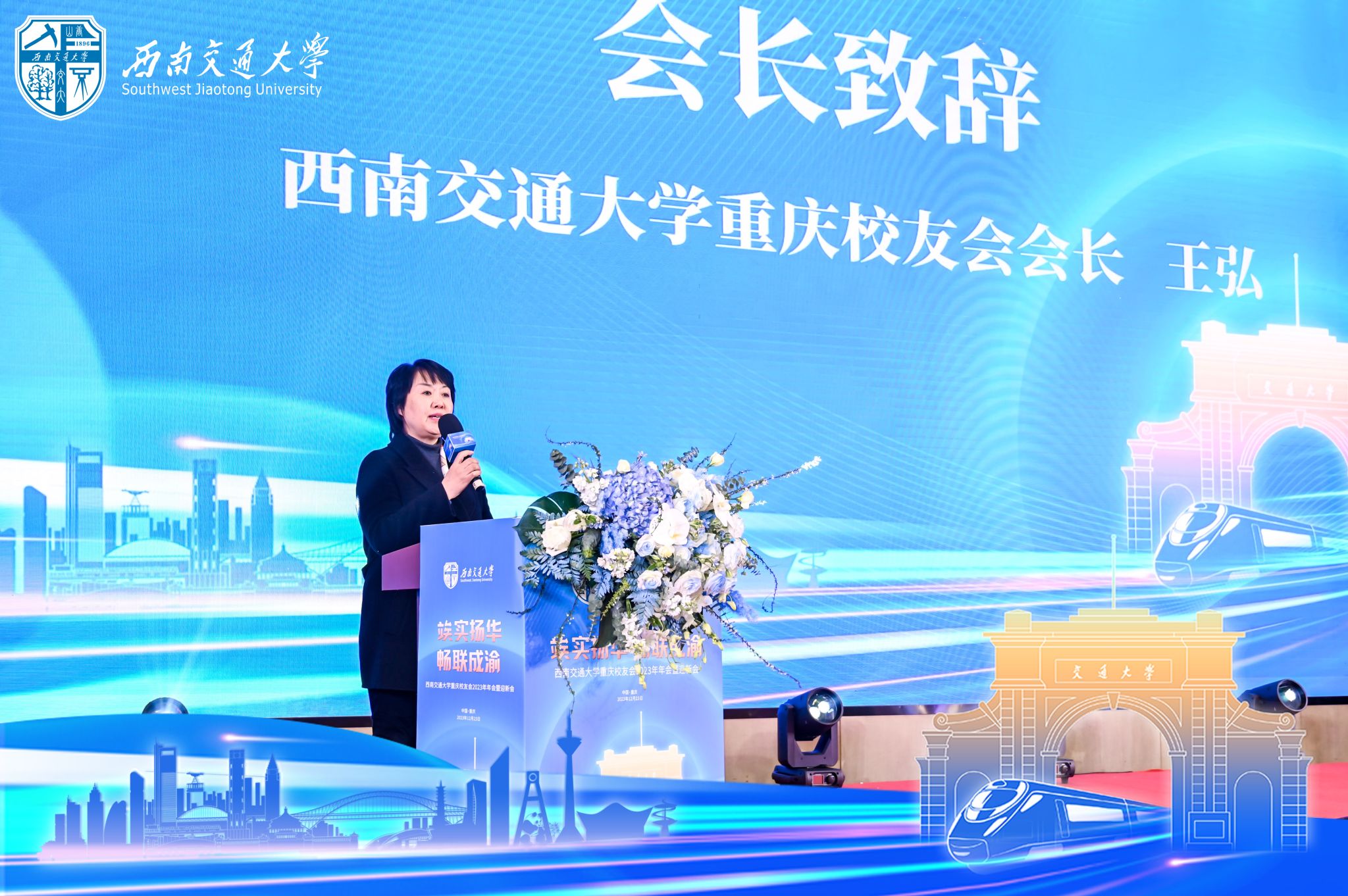 重庆校友会会长、1981级机车柴油机专业校友王弘致欢迎辞。王弘代表重庆校友会向母校和各方来宾表示欢迎和感谢。她回顾了重庆校友会2015年恢复活动以来的重要发展历程,介绍了近三年来渝就业生活的校友情况,鼓励新老校友加强联系和互动。她表示,今后会继续加强与母校的沟通和合作,始终与母校紧密相连,为母校开展在渝校地合作、校企合作搭建更多平台,更多更好地助力母校发展和“双一流”建设。
