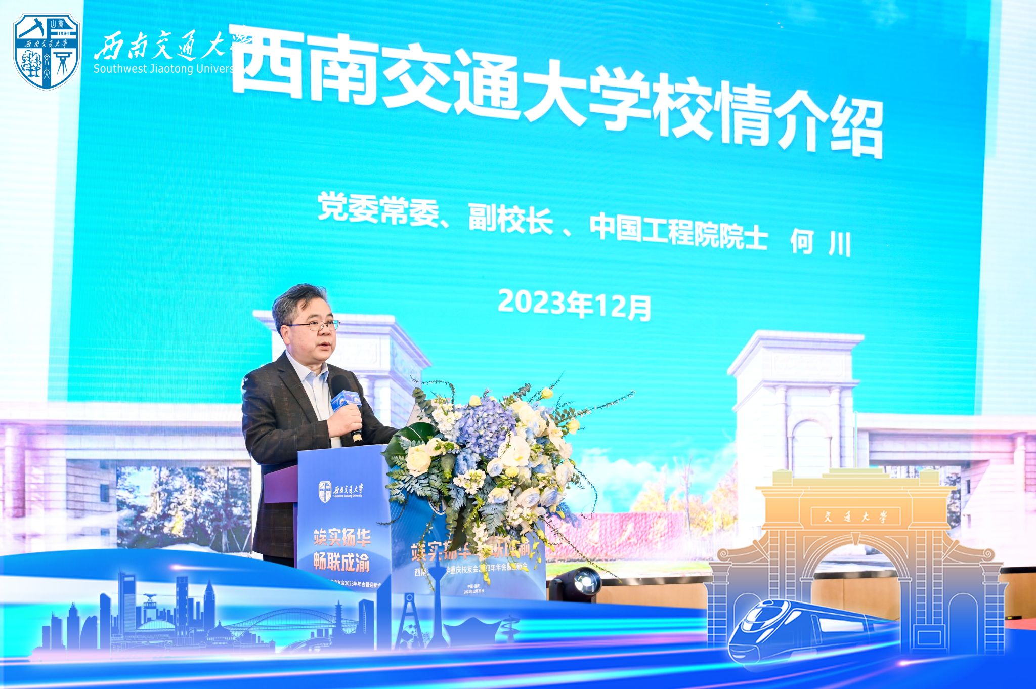 何川院士致辞并作校情介绍。他代表学校对重庆校友会和广大在渝校友对母校的关心支持表示感谢。他回顾了学校的办学历史,介绍了学校近年来在学科建设、人才培养、科研工作、科技成果、人才引进、师资队伍建设等方面的发展成绩,并表示,学校所取得的每一项成就,都与校友们对母校的深切关心、大力支持密不可分。他鼓励广大在渝校友和重庆校友会抢抓“成渝双城经济圈”建设机遇,奋勇争先,在推进中华民族伟大复兴伟业中贡献更多交大智慧和力量,并邀请校友们常回家看看。