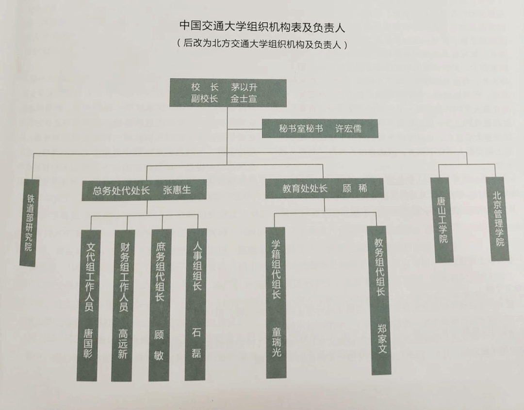 1950年2月8日,铁道部以央人字第115号令,任命了校部干部名单: “暂准中国交通大学校部组织机构,并派许宏儒为秘书室秘书,顾稀为教育处处长,郑家文暂代教务组组长,童瑞光暂代学籍组组长,张惠生暂代总务处处长,石磊为人事组组长,顾敏暂代庶务组组长。”从此,校部的组织机构开始履行各自的职责。