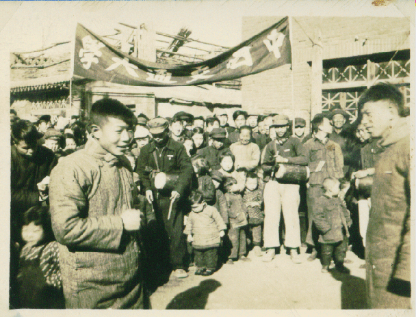 在唐山街头演戏(左第一人为我校原党委书记王润霖)