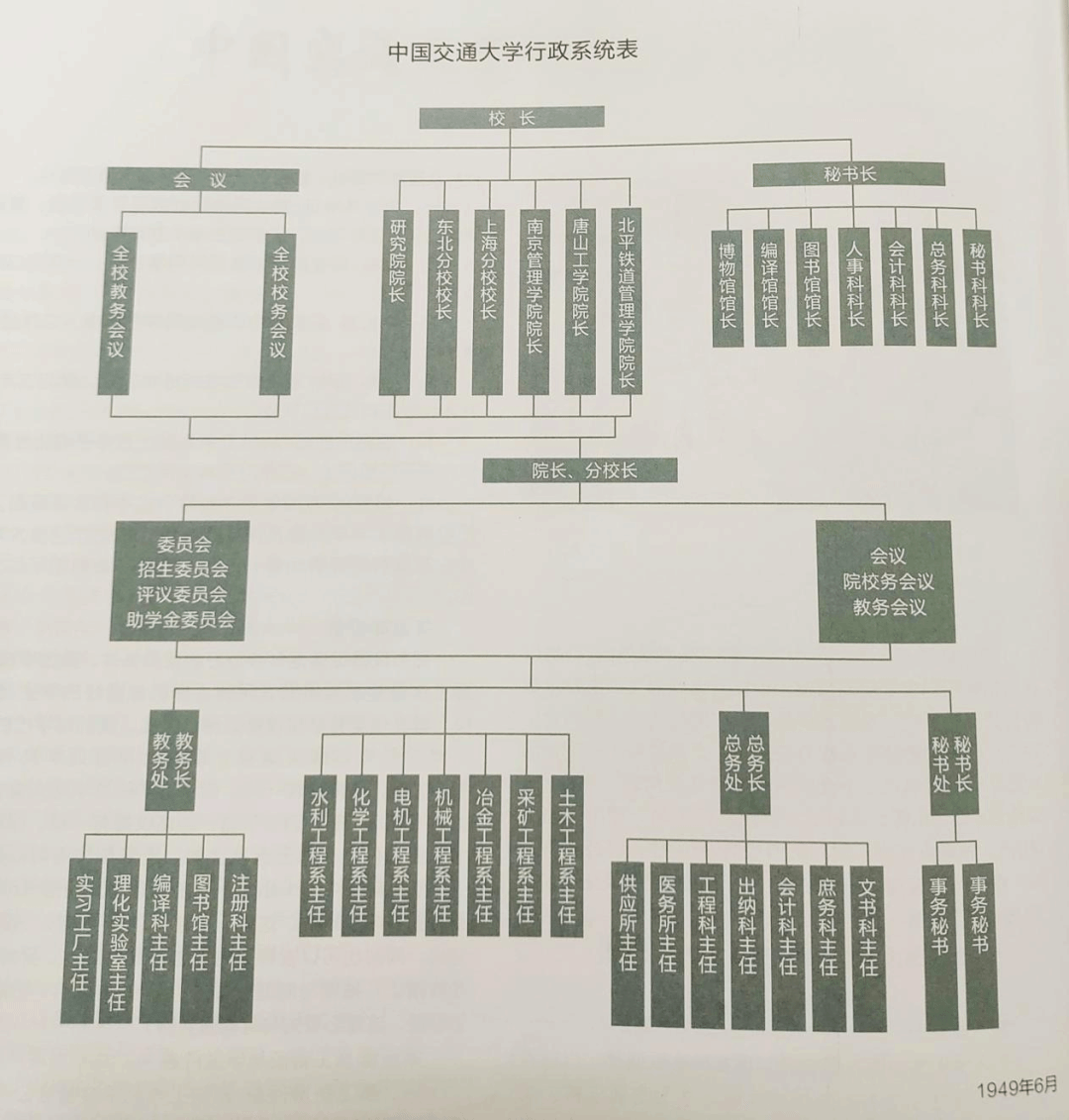 “为便于统一中国交通大学唐、平两院工作起见,在北平东交民巷34号,设中国交通大学校部,在此期间先设校部办公室,暂由张惠生担任秘书,处理日常工作,今后两院工作由该办公室汇办为要”。1949年10月1日,中华人民共和国成立,中央人民政府正式设立铁道部,中国交通大学属中央人民政府铁道部直辖。1949年10月18日,铁道部任命桥梁专家、我校校友茅以升为中国交通大学校长,11月,任命铁路运输专家金士宣为中国交通大学副校长。随后,茅校长、金副校长都来到校部任职,茅校长就住在了校部的楼上。